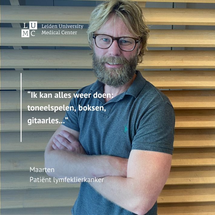 Op 1 februari 2022 werd er een PET-scan gemaakt: er waren geen kankercellen meer te zien. Reden voor een feestje. Maar die donderdag testte ik positief op corona, dus de borrel ging niet door. Door de CAR-T-therapie ben ik beter geworden en kan ik alles weer doen. Ik ben begonnen met kickboksen en mijn conditie is top. Ik ben sinds kort regisseur voor onze toneelgroep en zit op gitaarles. Alleen mijn weerstand is niet meer wat het is geweest, ik pak elk virusje mee. En bij een muggenbeet wordt mijn arm of been regelmatig vier keer zo dik. Ik loop nu bij de poli Infectieziekten om dat verder te onderzoeken.”