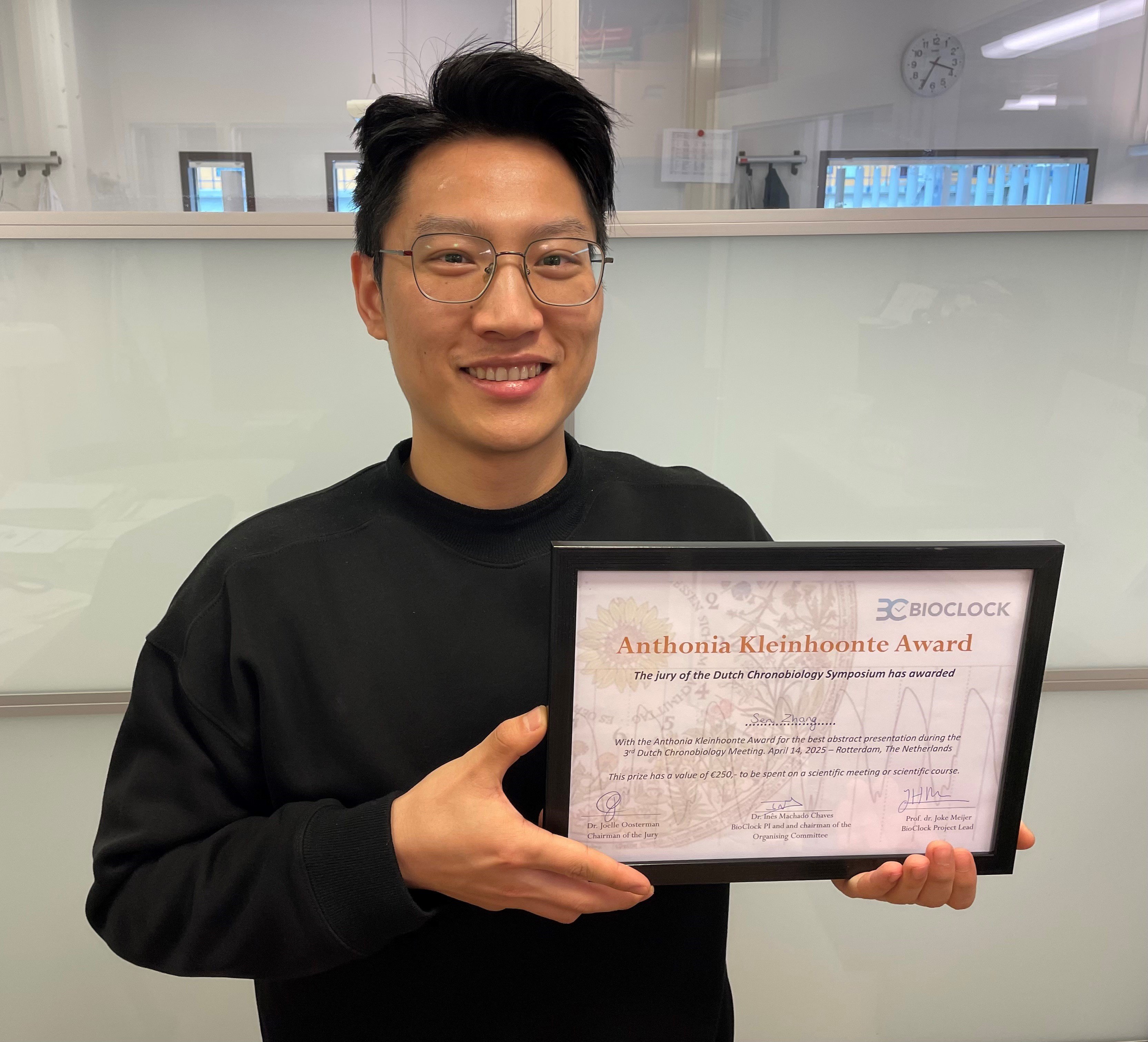 Maandag 14 april mocht Sen Zhang, promovendus bij de sectie Endocrinologie van de afdeling Interne Geneeskunde, de Anthonia Kleinhoonte Award in ontvangst nemen voor de beste posterpresentatie tijdens het 3rd Dutch Chronobiology Symposium in Rotterdam. De prijs bestaat uit een oorkonde en een geldbedrag.