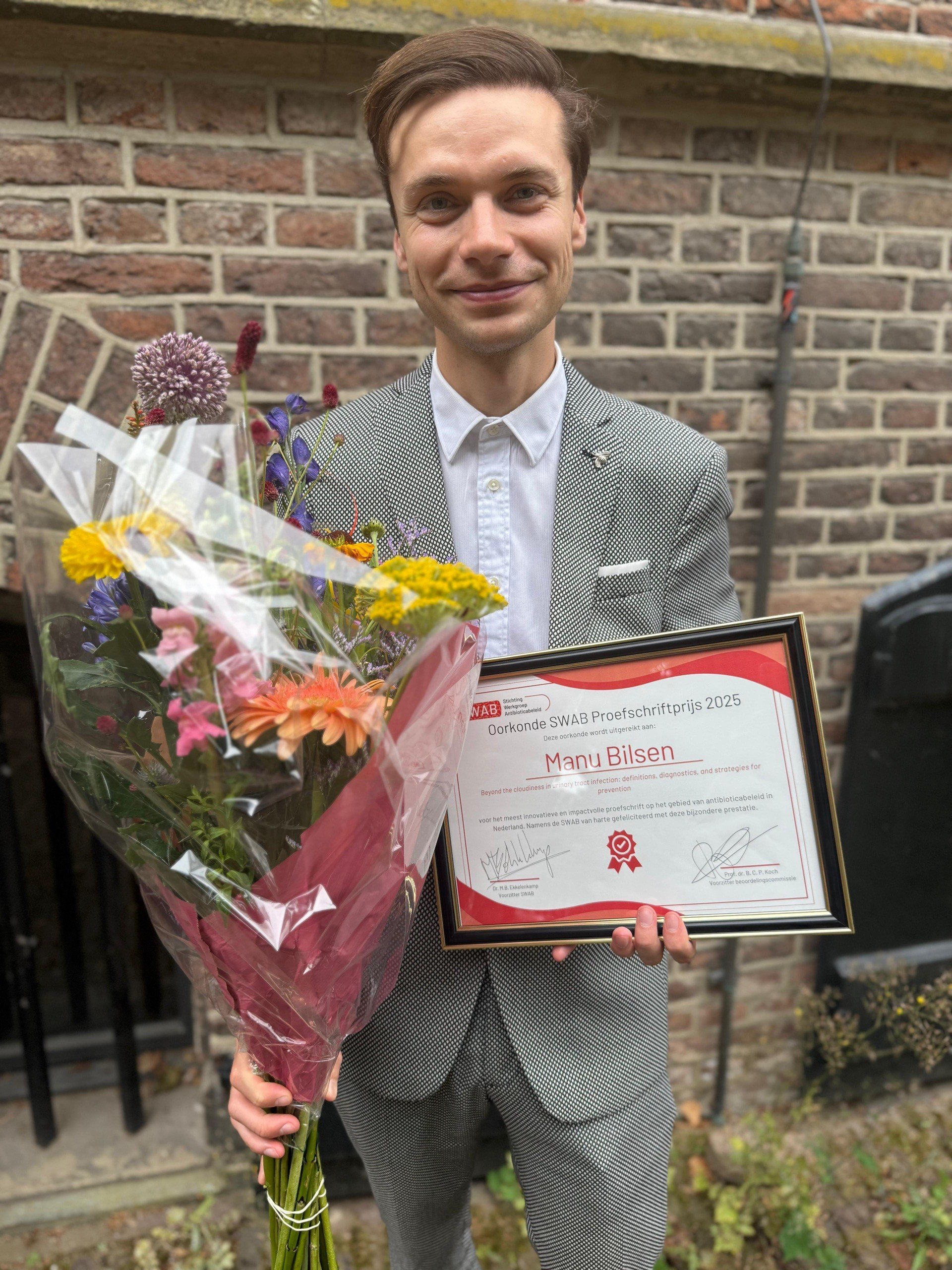 Dr. Manu Bilsen (AIOS interne, differentiatie infectieziekten) heeft de allereerste SWAB Proefschriftprijs gewonnen. De prijs werd uitgereikt tijdens het 25e SWAB-symposium op 26 juni. In zijn proefschrift 'Beyond the cloudiness in urinary tract infections' onderzocht hij hoe urineweginfecties beter gedefinieerd, herkend en voorkomen kunnen worden.