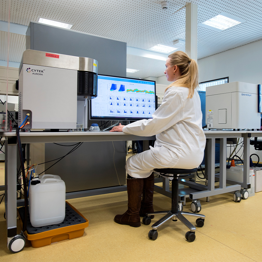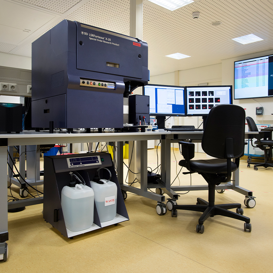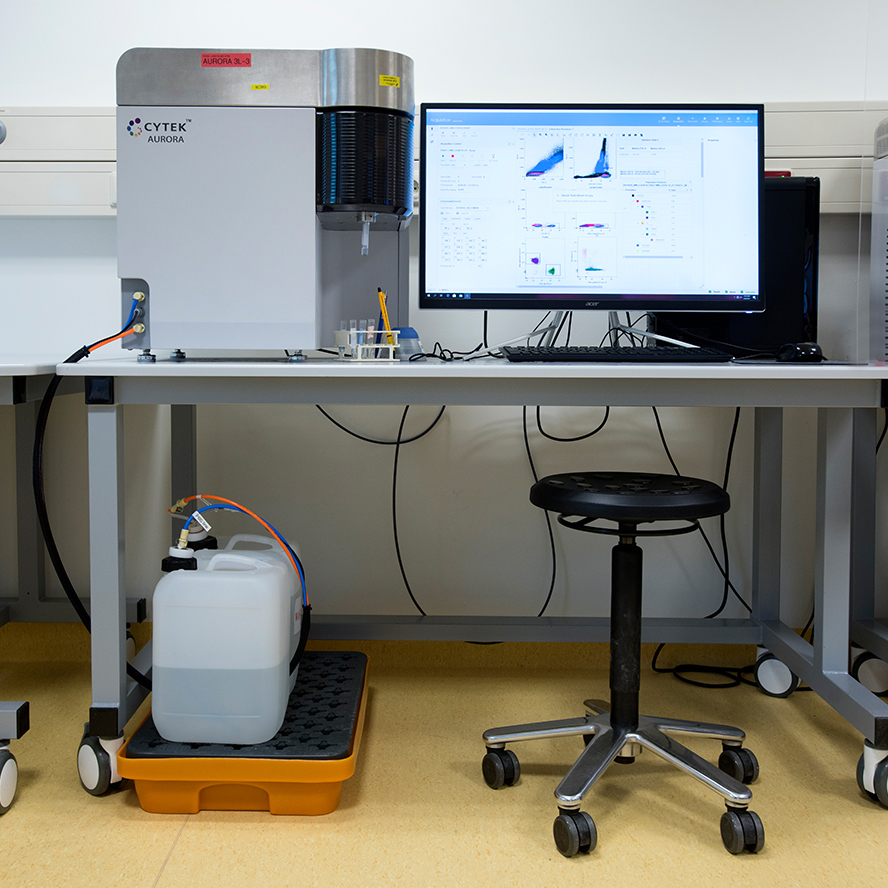 The FCF operates four standard conventional flow cytometers (up to 8 fluorochromes) and seven advanced conventional flow cytometers (up to 12 fluorochromes), including research-grade instruments located in biosafety level II and III laboratories (ML-II and ML-III) for analyzing biohazardous materials.