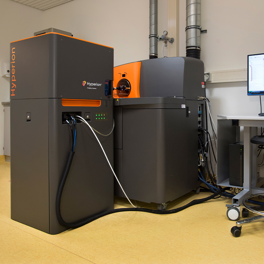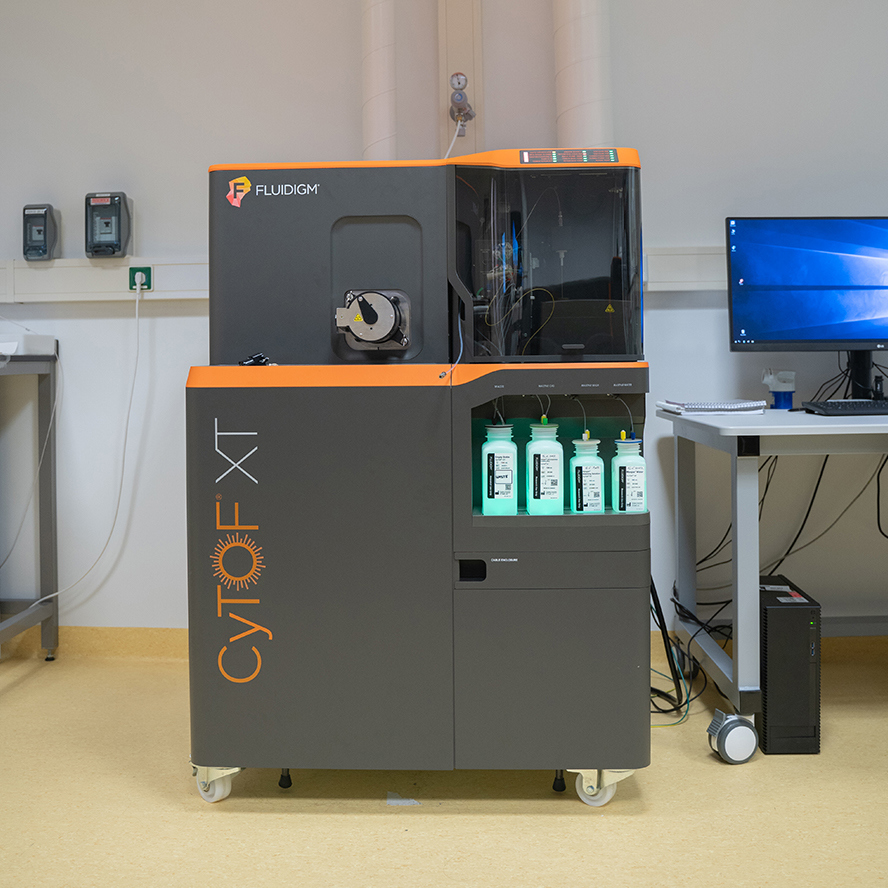 The FCF has three mass cytometers; cytometry by time of flight, or CyTOF. These cytometers can simultaneously measure more than 50 “labels”, i.e., metals of different mass, per cell. Two CyTOF instruments can also measure cells in situ in tissue sections.