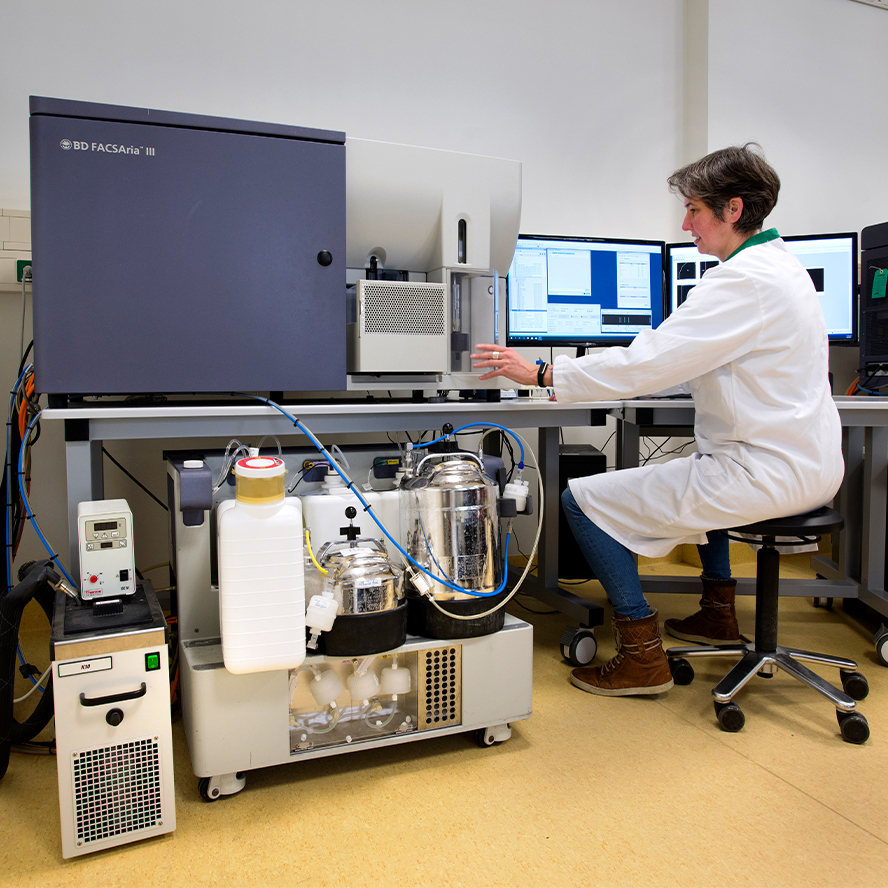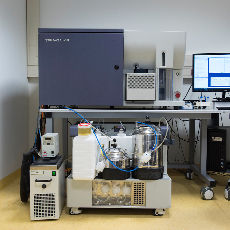 The FCF operates five cell sorters (up to 17 fluorochromes), which can be used to sort specific subpopulations for further study and analysis.