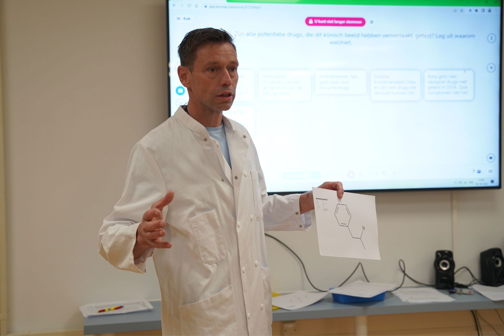 De studenten kregen vervolgens de regie om deze situatie tot een zo goed mogelijk einde te brengen. Zij moesten aanwijzingen geven aan de SEH-arts, testuitslagen interpreteren en snel handelen. Na het praktijkgedeelte gaven de aanwezige ambulanceverpleegkundige, beveiliging en toxicologisch analist toelichting over hun werk.