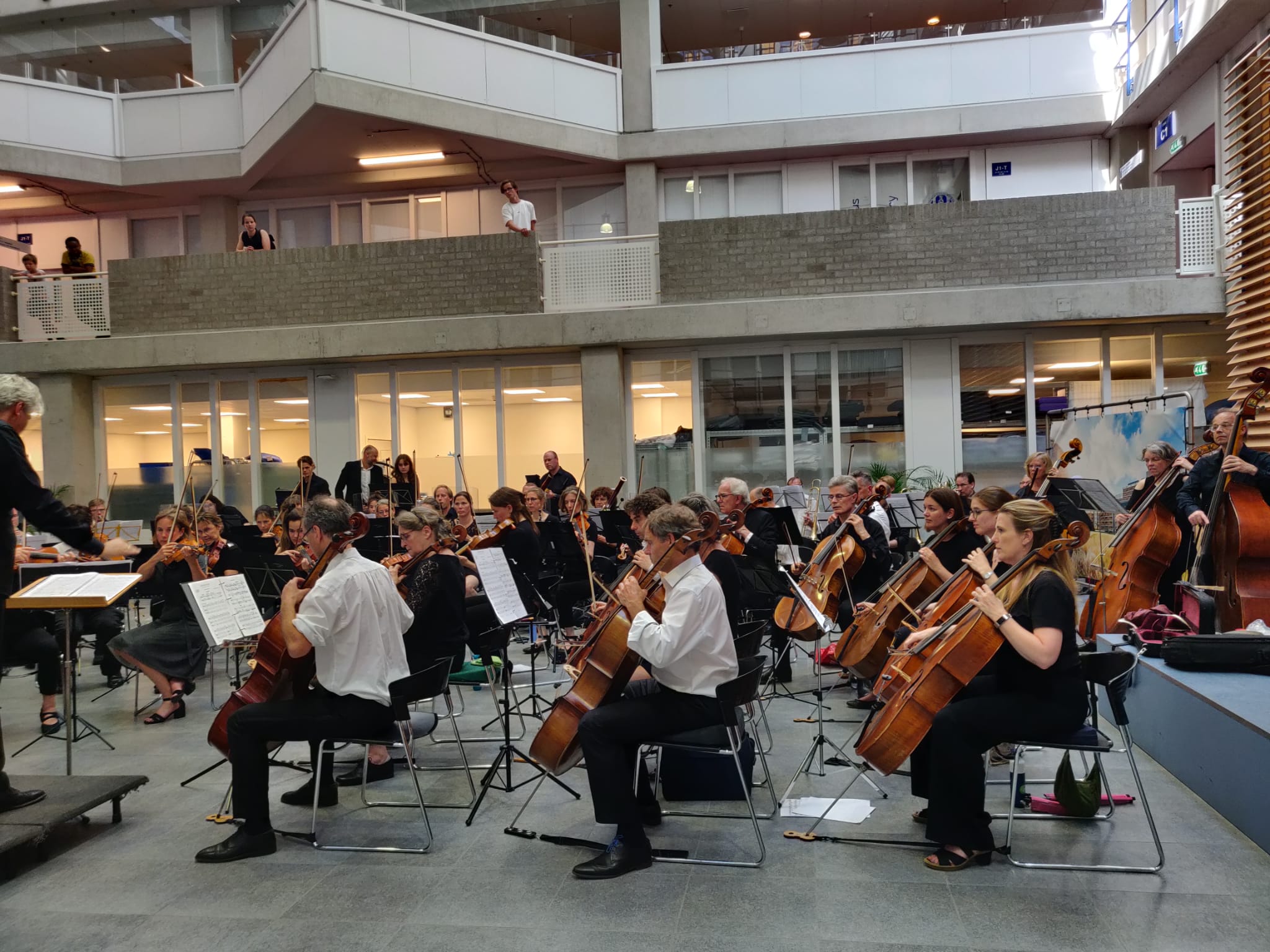 Ook patiënten luisteren mee, soms zelfs vanuit een bed dat even naar het plein wordt gereden. Daarnaast zijn er passanten, bezoekers en medewerkers die spontaan blijven staan. “Je ziet mensen vanaf de balustrades omlaag kijken, nieuwsgierig naar wat er gebeurt. Dat maakt het heel bijzonder.”