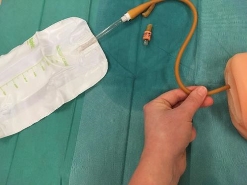 3. Wacht tot al het water uit de katheter is gestroomd. Daarna trekt u de katheter