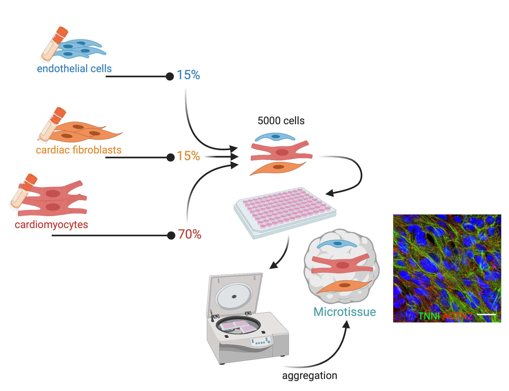 The heart is a complex tissue composed by several cell types including cardiomyocytes, endothelial cells, smooth muscle cells, fibroblasts and other connective tissue cells. We are using hiPSCs to develop 3D-cardiac microtissue constructs comprising both cardiomyocytes and non-myocyte cells to more accurately reproduce the multicellular organization and the dynamic function of antive heart (figure 2). These constructs will assist cardiovascular disease modelling and drug screening.