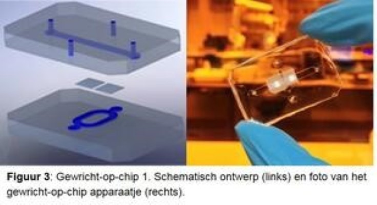 In order to study the various disease processes in detail, we are developing a joint-on-a-chip together with Eindhoven University of Technology (Figures 3 and 4). This is a tiny device that has two connected spaces. One is filled with cartilage cells, the other with bone cells from the RAAK study, and new cartilage and bone tissue is created in the device using growth factors. Because we expose the cells to mechanical stress, for example by hitting the cells with tiny hammers, we can mimic the osteoarthritis process. We also change the genetic makeup of the cells to investigate patient-specific causes. By accurately determining where things go wrong during osteoarthritis in different patients, we also get leads for the development of (new) medicines. We also call this tailor-made treatment.