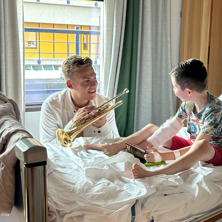 “Eerlijk gezegd twijfelde ik of ik trompet kon spelen bij zieke kinderen. Maar ik merkte vrijwel meteen: dit vinden ze écht heel leuk. Trompet spelen is voor mijzelf een uitlaatklep, ik kan mijn gevoel erin kwijt. Ik kan me dus goed voorstellen dat muziek ook voor kinderen in het ziekenhuis ontspannend is. Het zorgt ervoor dat ze even vergeten dat ze ziek zijn. Het maakt volgens mij niet uit of je ze blij maakt met een clown, een knuffelkonijn of een jongen met een trompet.”