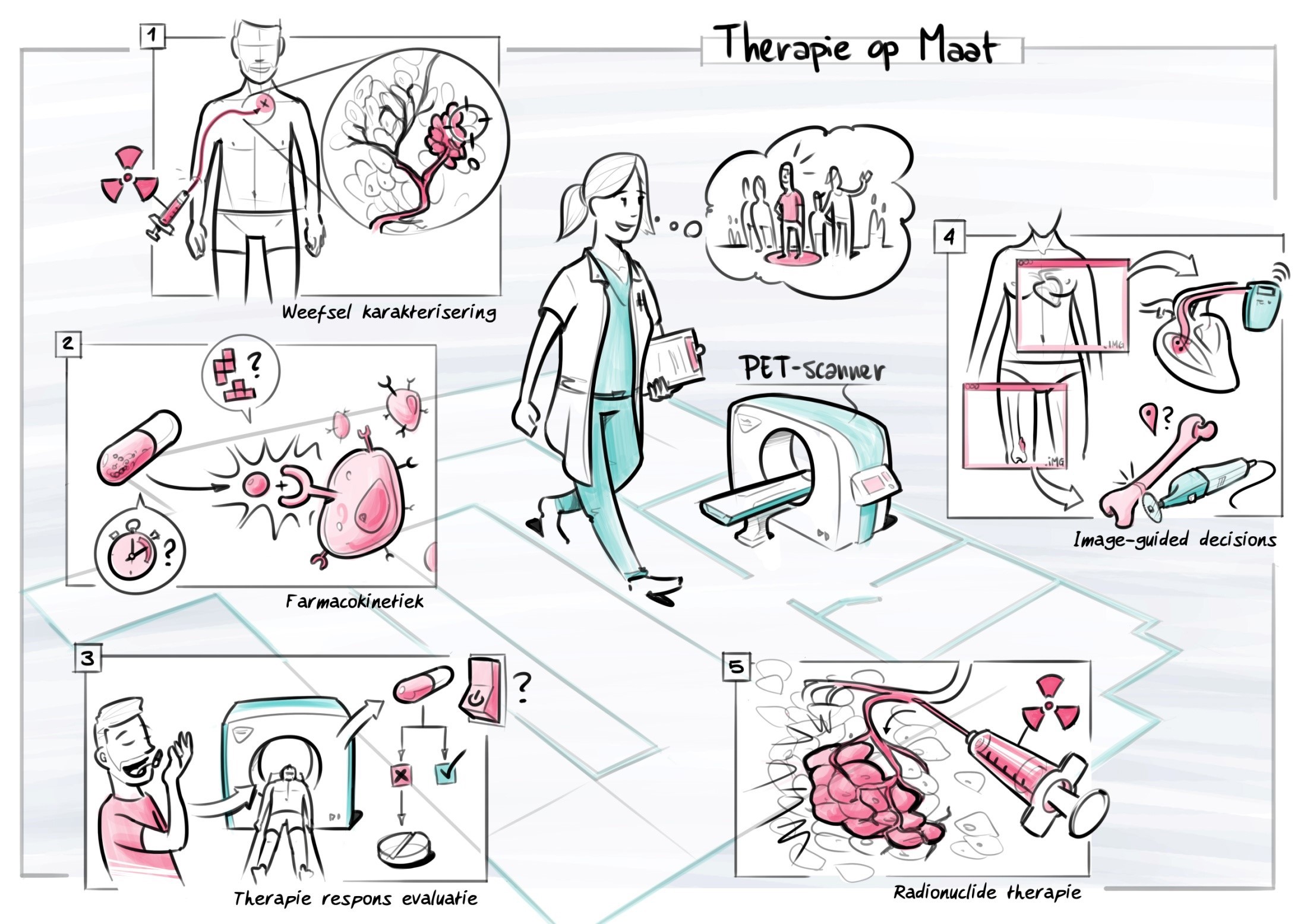Currently studies are running on hypoxia imaging in proton therapy, on PSMA-expression in advanced sarcoma and urothelial cell carcinomas, to study the activation of human brown adipose tissue by medication, to identify predictive PET/CT imaging biomarkers (radiomics) for the efficacy of afatinib treatment, to assess whether radiomics extracted from pretreatment PET/CT in locally advanced cervical cancer patients, treated with neoadjuvant chemoradiotherapy followed by surgery, could be used to identify responders, to investigate the performance of [18F]-NaF PET/CT to monitor treatment response of fibrous dysplasia to RANK1-inhibition and to investigate the performance of [89Zr]trastuzumab PET/CT imaging of HER2 positive breast cancer for predicting pathologic complete response after neoadjuvant chemotherapy.