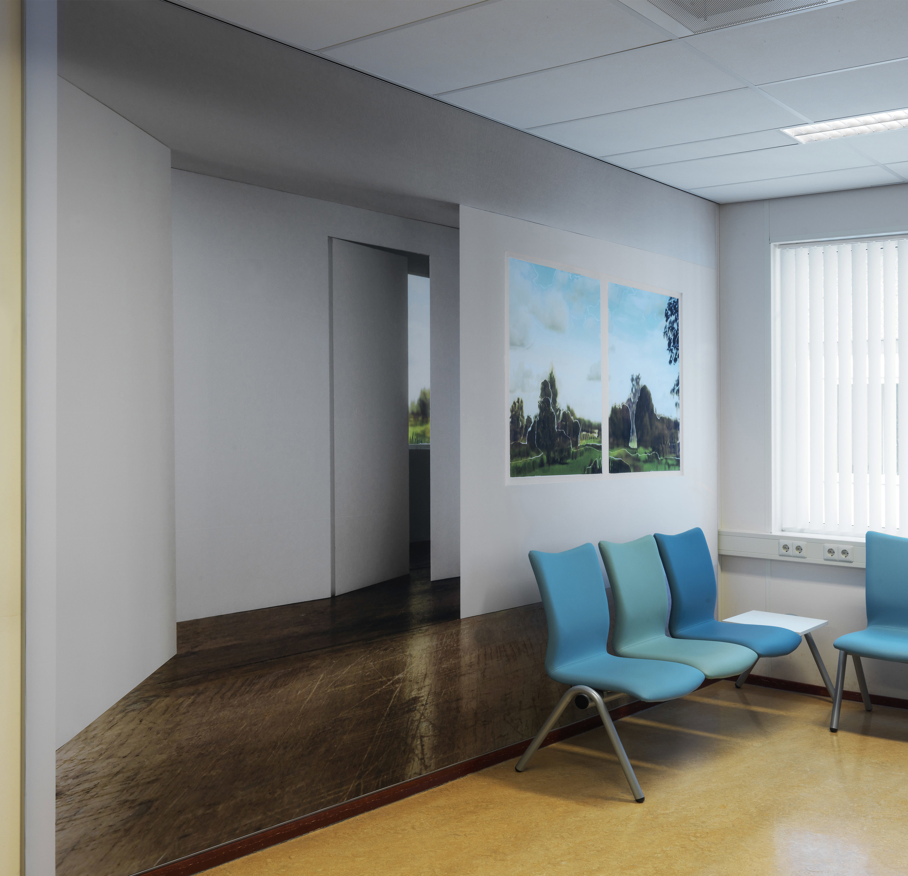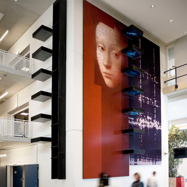 In de entreehal in het hoofdgebouw van het LUMC is een kunstwerk van Anna Thalia Benus te zien. Het werk bevat een vroom vrouwenportret als symbool voor de mens in het ziekenhuis, geconfronteerd met ziekte, onderzoek en zorgen. Ook zijn de bouwstenen voor DNA (nucleotiden) te zien, als symbool voor wetenschappelijk onderzoek. En röntgenfoto’s die de evolutie van het leven weergeven. Het kunstwerk verbeeldt de drie kerntaken van het LUMC: patiëntenzorg, onderwijs en onderzoek.