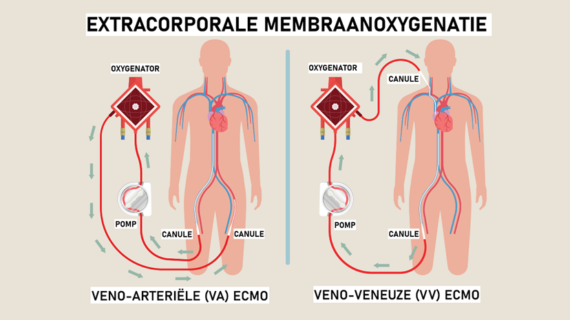 Afbeelding: Schematische weergave van de twee types ECMO (aangepast). Via canules in de liezen wordt het bloed vanuit het lichaam geleid naar de bypass-machine. Deze bestaat onder andere uit een oxygenator, die zuurstof toevoegt aan bloed (wat normaal door de longen wordt gedaan) en een pomp, die het bloed weer het lichaam in pompt (wat normaal door het hart wordt gedaan) via een canule in de lies (bij VA ECMO) of nek (bij VV ECMO).