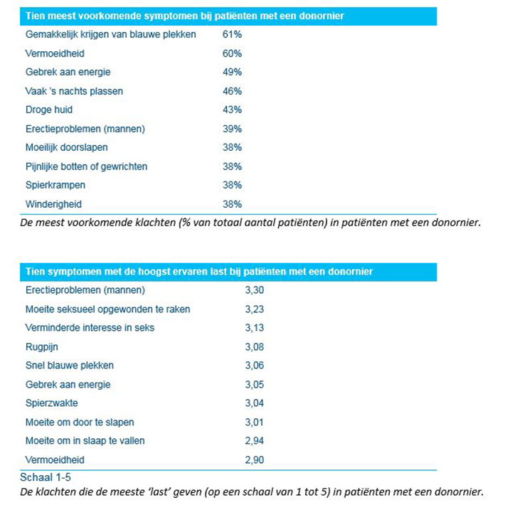 De meest voorkomende klachten zijn het makkelijk krijgen van blauwe plekken en, net als in dialysepatiënten, vermoeidheid. Klachten op seksueel gebied worden met name als ernstig ervaren. Inmiddels is gestart met het verder in kaart brengen van vermoeidheidsklachten. Ook zijn we in overleg met urologen en seksuologen over hoe we patiënten met klachten op seksueel gebied het beste kunnen helpen.
