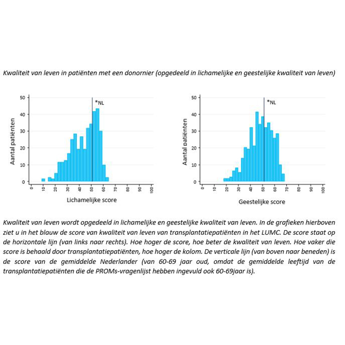 De PROMs worden afgenomen bij onze transplantatiepatiënten en dialysepatiënten. Deze antwoorden kunnen worden vergeleken met de antwoorden van de Nederlandse bevolking. Transplantatiepatiënten vinden hun lichamelijke kwaliteit van leven slechter dan de algemene Nederlandse bevolking, maar wel beter dan dialysepatiënten dit aangeven. De geestelijke kwaliteit van leven van transplantatiepatiënten verschilt niet veel met de score van de Nederlandse bevolking en van dialysepatiënten.