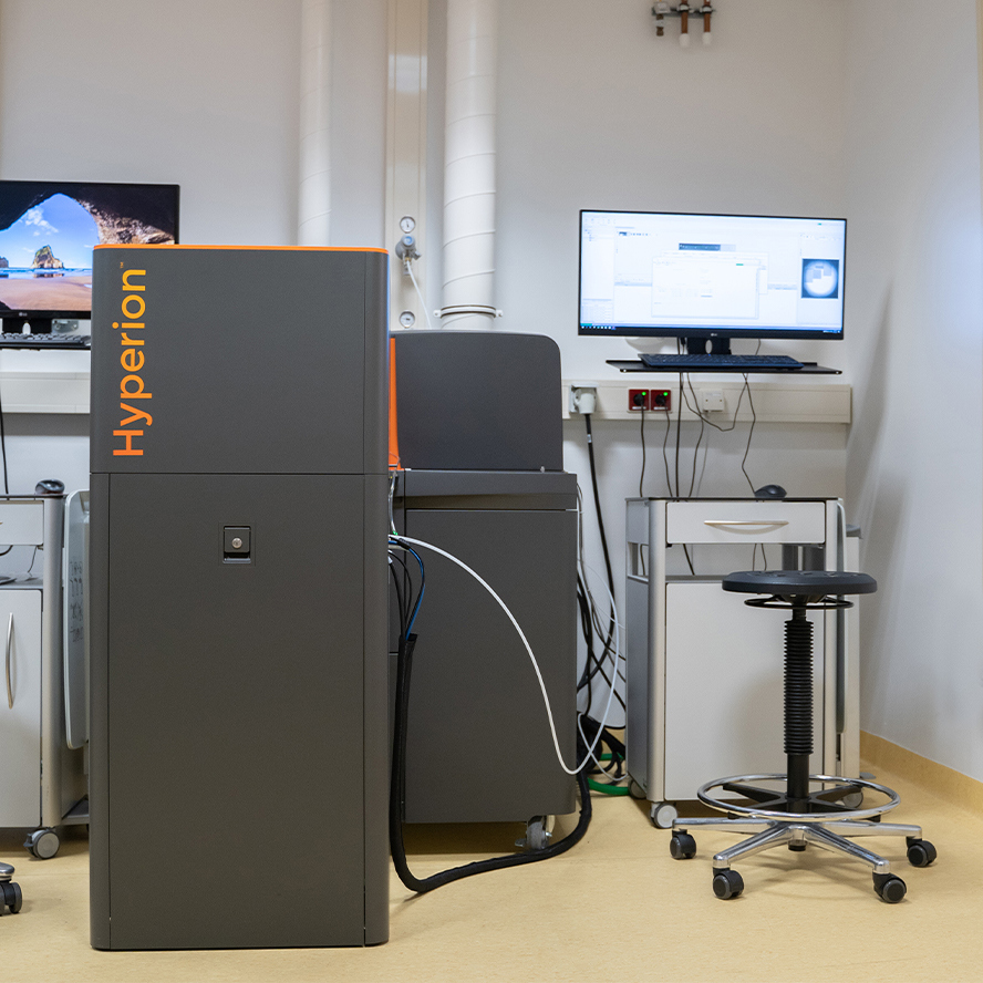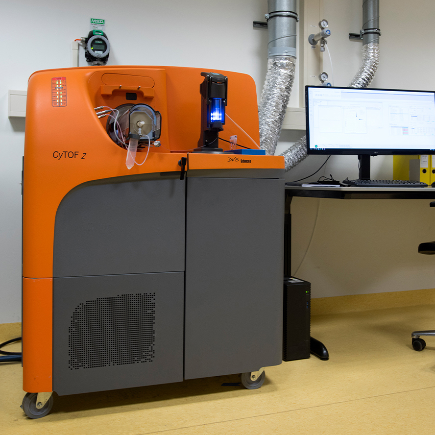 The FCF has three mass cytometers; cytometry by time of flight, or CyTOF. These cytometers can simultaneously measure more than 50 “labels”, i.e., metals of different mass, per cell. Two CyTOF instruments can also measure cells in situ in tissue sections.